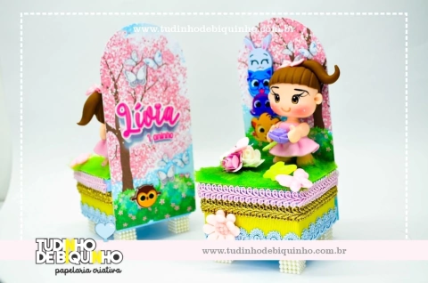 Caixinha cenário com base em plástico resistente, papel 240gr, aviamentos e biscuit.