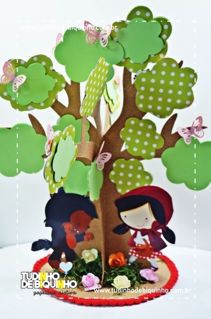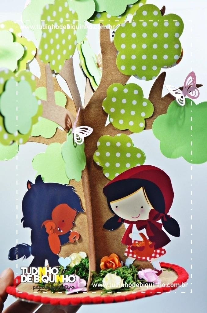 Árvore em 3D com personagens, flores, aviamentos e glitter.