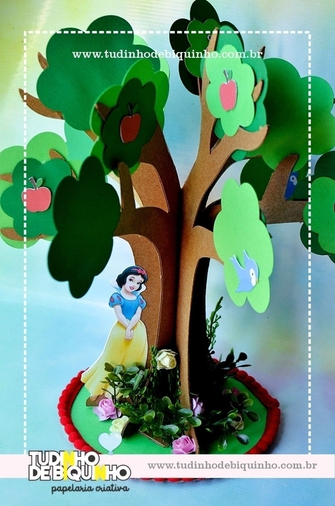 Árvore em 3D com personagens, flores, aviamentos e glitter.